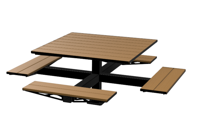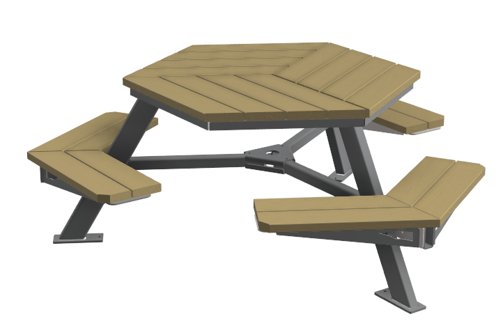 La table Hexa est conçue pour accueillir confortablement jusqu'à 6 personnes. Sa configuration modulable permet de retirer certaines assises pour un accès facilité aux personnes à mobilité réduite. Elle représente un choix idéal pour les espaces publics.
